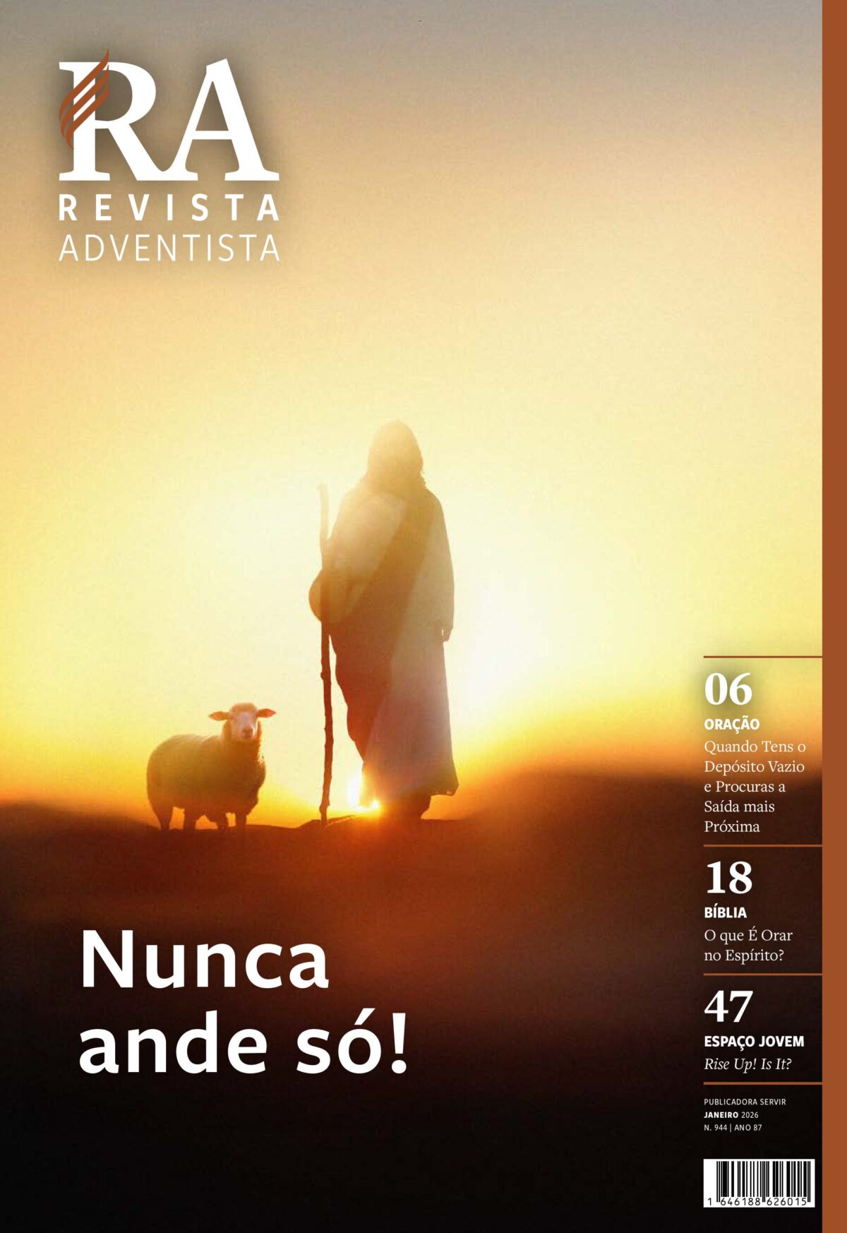 Nunca Ande Só! (Espiritualidade) Don MacLafferty explora a profunda dependência que Jesus tinha do Seu Pai durante o Seu ministério na Terra. O artigo oferece dicas práticas para manter uma comunhão constante com Deus, tais como desligar o telemóvel antes de dormir e dedicar o primeiro tempo da manhã ao estudo bíblico e à oração silenciosa.